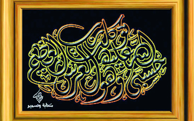 لوحة جميلة كتب فيها الخطاط محمود عبدالجواد «حسبي الله عليه توكلت وهو رب العرش العظيم»، بالخط الديواني.