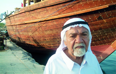 محمد عبدالله باحاجي أمام سفينته الخشبية. الإمارات اليوم