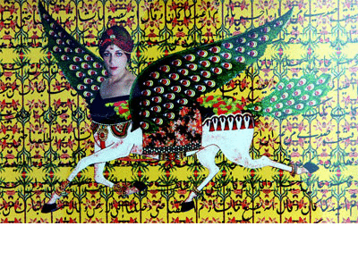 كولاج تصويري كانت أعمال الفنانة اللبنانية شذا شرف الدين، مختلفة عن بقية الأعمال الموجودة في المعرض، فأعمالها تقوم على الكولاج التصويري، فهي تحاول أن تجمع صورا «مع مشاهد تركبها من الخارج لتبني العمل بكليته، وقد حاولت شرف الدين من خلال أعمالها أن تلقي بالضوء على حقبة الحكم المنغولي، آخذة منمنمات كانت معروفة لدى الفارسيين بين القرنين السادس عشر والثامن عشر، ومعتمدة على الجمع لتبتكر مخلوقات غريبة في لوحاتها، هي مخلوقات بوجوه بشرية وأجساد أحصنة تجسد القوة والحكمة. |