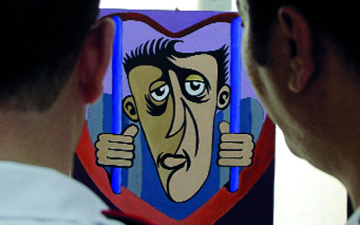 شرطيان يتأملان تفاصيل لوحة أحد السجناء. رويترز