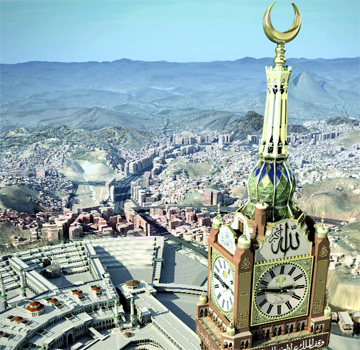 ساعة مكة ترتفع 400 متر عن مستوى الأرض. أ.ب