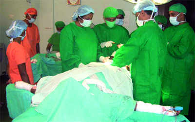 فريق الجراحين خلال إزالة المسامير. أ.ف.ب