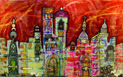 ومن هدوء أعمال داكشا، إلى إبهار لوحات اميلي غوردن التي اعتمدت فيها على «ميكس ميديا» لتقدم أعمالاً ذات بريق لافت، استخدمت فيه ثيمات ومفردات من التراث العربي والشرقي، كقطع من الحلي وأدوات الزينة، لتضفي على اللوحات أجواء شرقية، مع التركيز على العمارة القديمة كالمنازل والأبواب وغيرها.