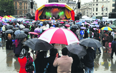 لم تمنع الأمطار المئات من المشاركة في احتفال متأخر بعيد الفطر، في واحدة من أشهر الساحات في العاصمة البريطانية لندن أول من أمس، وأقيم احتفال «العيد في الساحة» بميدان الطرف الأغر، وبرعاية رئيس بلدية لندن بوريس جونسون، وعزفت الموسيقى في الساحة بينما تمايل المشاركون بخفة معها، ممسكين جيدا بالمظلات لحمايتهم من الأمطار، وسار السائحون بجوار البريطانيين عند عمود نيلسون الذي يقع بين مبنى ناشونال غاليري ومباني البرلمان البريطاني، التي توجد ساعة «بيغ بن» الشهيرة بالقرب منها.