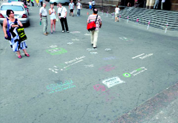 في موسكو، أكثر مدن أوروبا كُلفة، يعجز المرء عن تحمل نفقات الإعلانات الدعائية. لذا لجأت الشركات لبديل طريف، فهي تكتب إعلاناتها على الإسفلت مباشرة وهو ضرب من الدعاية في طريقه إلى الانتشار. بدأ الأمر برسم لقلب أحمر اللون على الرصيف باستخدام عبوة أصباغ بخاخة، ليعلن عن أحد مصففي الشعر، بعدها ظهر سهم أزرق يعلن عن حانة، الآن لا تكاد تجد موضع قدم أمام محطة قطارات أنفاق بروليتارسكايا في موسكو، يخلو من إعلان.