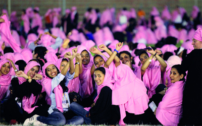 ووصلت النساء إلى المجمع يرتدين العباءة التقليدية السوداء، وهي اللباس الإجباري للنساء في الأماكن العامة في المملكة، إلا أنهن ما إن دخلن الاستاد حتى ارتدين وشاحاً ومنديلاً ورديي اللون، فحولن المجمع إلى بحر بشري وردي اللون.