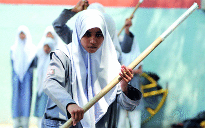 تلميذات هنديات مسلمات يؤدين عرضاً في الفن القتالي الشهير «فوفينام»، الذي تعود أصوله إلى الفيتنام. ويميل كثير من الأسر الهندية إلى تربية بناتهن على الفنون القتالية لحماية أنفسهن من أي اعتداء يتعرضن له. ويتميز هذا الفن القتالي بأنه يعتمد على تعلم مهارات خاصة بالتعامل مع السيوف والعصي، وهو قتال هدفه الدفاع وليس الهجوم على الآخرين.
