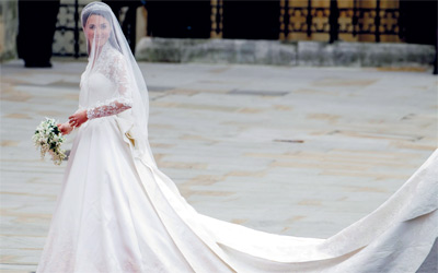 وفي وقت سابق كشف عن السر الكبير المتمثل بفستان الزفاف، عندما ترجلت كيت والبسمة تعلو وجهها من سيارة الرولز رويس الملكية امام أعين نحو ملياري مشاهد عبر العالم. فقد اختارت فستان عرس أبيض عاجياً مع طرحة طولها 2.70 متر، واعتمرت إكليلاً على رأسها. وقد صممت الفستان المديرة الفنية لدار الكسندر ماكوين للأزياء البريطانية، سارة بورتون، التي قالت «شعرت بالشرف والفخر عندما طلب مني أن أتولى تصميم الفستان، وأنا فخورة بما أنجزه فريق الكساندر ماكوين». وأضافت بورتون أنها عملت هي وفريق عملها وسط إجراءات سرية مشددة.