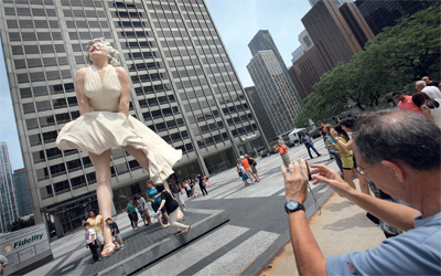 وكشف عن التمثال الذي يبلغ ارتفاعه 7.92 أمتار في شارع ميتشيغن، بتمويل من مجموعة «زيلر ريالتي»، وهو تجسيد فعلي لشكل مونرو بفستانها الأبيض المتطاير الذي تحاول منعه من الكشف عن مفاتنها. يشار إلى أن مارلين مونرو، واسمها الحقيقي نورما جين بيكر، تعد أسطورة في عالم السينما الأميركية، وتوفيت منتحرة عن 36 سنة، إثر تناولها جرعة زائدة من الدواء.