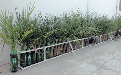 وفي هذا السياق، أوضح عبدالرزاق أنه استخدم قناني المياه البلاستيكية الفارغة بحجم 1.5 لتر وخمسة لترات، بعد أن قام بتجهيزها بطريقة خاصة، من حيث الفتحات المناسبة، ووضع التربة فيها، إذ يساعد هذا الاستخدام على إعادة استخدام تلك القناني أكثر من مرة، وبالتالي الإسهام في حماية البيئة.
