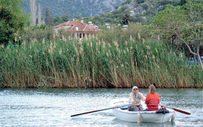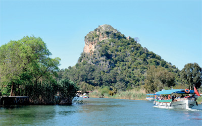 ومَن يفضل استخدام وسائل المواصلات العامة، فيمكنه السفر بمراكب دولموس في رحلة تستغرق 45 دقيقة تقريباً في النهر الذي يتخذ مساراً متعرجاً بين الجزر الصغيرة ويسير متثاقلاً إلى أن يعانق البحر. وبشيء من الحظ يرى السياح طائر القاوند والصقور، كما تعيش هنا الضفادع البحرية والثعابين مثل ثعبان النرد.