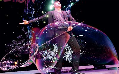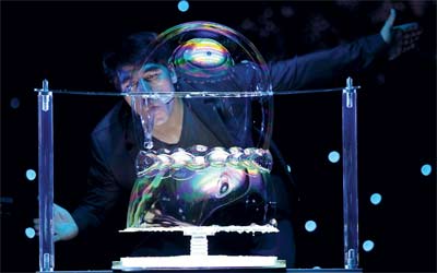 الفنان الكندي فان يانغ يقدم عرضاً للفقاعات في العاصمة التايلاندية بانكوك، أول الاسبوع. وقضى يانغ المولود في فيتنام 20 عاما لدراسة وبحث وتطوير صفات فقاعة الصابون الاعتيادية وتحويلها إلى شكل جمالي وفني، ويوصف يانغ بعالِم الفقاعات والفنان الذي استطاع أن يدخل السجلات العالمية من خلال فقاعة صابون.
