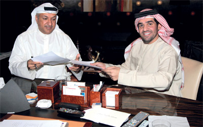 حسين الجسمي وسالم الهندي خلال توقيــــــــــــــــــع العقد الذي فسخه الفنـان مع الشركة. أرشيفية