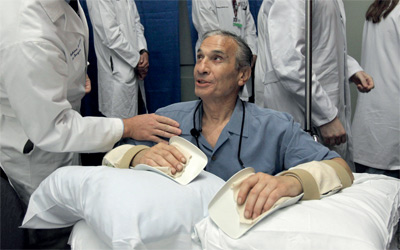 وأضاف مانجينو في مؤتمر صحافي، حيث كان يجلس على مقعد متحرك واضعاً ذراعيه ويديه على مجموعة من الوسائد، إنه صلى من أجل أن يتمكن من لمس وجوه أحفاده، وأن يمسح بيده على رؤوسهم، وأن يعلمهم كيف يقذفون الكرة. وفقد مانجينو الذي يقيم في حي ريفر بولاية ماساتشوستس ساعديه وساقيه، بعدما أصيب بتسمم دموي عام .2002 وقال المستشفى إن الجراحة المعقدة تضمنت زراعة جلد وأوتار وعضلات وأربطة وعظام وأوعية دموية بالساعدين واليدين. وذكر الأطباء أن مانجينو حرك بشكل مستقل أصابعه بعد أيام قليلة من الجراحة، ووصفوا النتائج بأنها تمثل «نجاحاً مدوياً». وسيستغرق شفاؤه أشهراً عدة، ويتوقع الأطباء أن يستعيد إحساس اللمس في غضون ما بين ستة إلى تسعة أشهر، مع استمرار العلاج لمساعدته على تعلم التقاط الأشياء والإمساك بها. وزراعة يدين هي الجراحة الثانية التي يقوم بها مستشفى بريغهام، وهو مؤسسة فرعية تابعة لكلية الطب بجامعة هارفارد. وتم زرع يدين للمرة الأولى في فرنسا عام ،1998 في حين جرت أول جراحة في الولايات المتحدة بعد ذلك بعام.