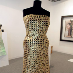تفرد غاليري «سوا» بمشروع فني مغاير اعتمد فيه على الثياب موضوعة اساسية يعبر من خلالها الفنانون بأساليب غير تقليدية عن رؤيتهم لمجتمعاتهم وأحوالها، باعتبار ان الثياب تعكس كثيرا من المعاني والدلالات حول صاحبها مثل جنسه وطبقته الاجتماعية والاقتصادية وربما دينه وثقافته. وبين الأعمال التي ضمتها المجموعة كان للربيع العربي حضوره في أكثر من عمل من بينها عمل للفنانين اللبنانيين زينة عاصي وعصام برهوش الذي يجسد فستانا أنيقا يفيض بالأنوثة والنعومة، ولا يملك كل من يراه من بعيد إلا الاعجاب به، خصوصا أنه صنع من دوائر ذات لون ذهبي آسر، لكن المفاجأة التي يدركها كل من يقترب من الفستان ليدقق فيه بنظرة متفحصة، ان حلقاته الذهبية ليست سوى رؤوس طلقات رصاص، في إشارة إلى الازدواجية التي تحملها بعض الأشياء والوجوه اللامعة الجذابة التي نراها، بينما هي في الحقيقة لا تهدف إلا إلحاق الضرر بالآخرين وخدمة أغراض ظالمة.