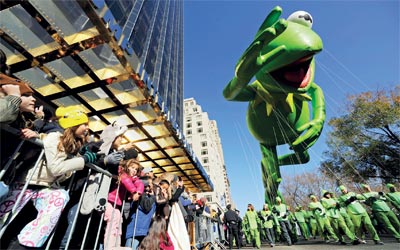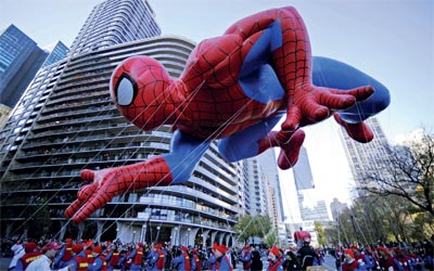 بالون الضفدع كيرميت وبالون سبايدرمان، في حديقة السنتال، في الاستعراض السنوي، أول من أمس، بمناسبة عيد الشكر في مدينة نيويورك، في الولايات المتحدة الأميركية، في العرض السنوي ، الذي بدأ في عام ،1924 وبالونات عملاقة من الأحرف من الثقافة الشعبية العائمة فوق شوارع مانهاتن.