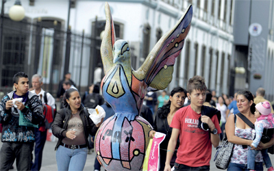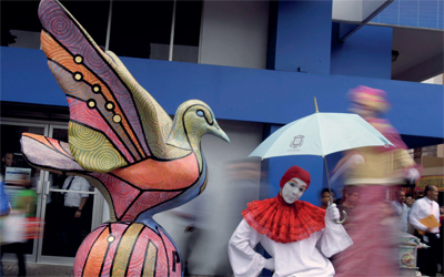 مارة يتأملون في منحوتات تجسد طير الحمام، ضمن فعاليات مهرجان «مسيرة السلام» الذي بدأت فعالياته 15 ديسمبر الجاري في كوستاريكا.