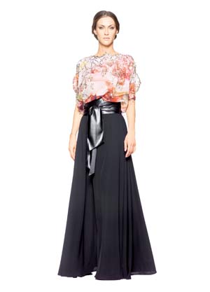 عباءة ذات تصميم عصري ومطوّر بقصة «الجمبسوت»، تبدو على شكل قميص وسروال واسع جداً من حرير «الشيفون» المطبّع بالزهور بالدرجات الهادئة، والجزء السفلي من «كريب الحرير» الفرنسي مزيّن بحزام جلدي عريض معقود بطريقة عفوية، من تصميم رفيعة بن دري. تبدأ الأسعار من 1300 درهم.