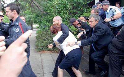 ووصلت المزايدة إلى 2000 دولار، غير أن الموقع سحبها لأنه قال إنه لا يحق لشخص أن يبيع غرضاً ليس ملكه. كما أن الرجل لم يقدم أية أدلة حاسمة تؤكد أن فردة الحذاء تخص جيلارد. وكان نحو 200 متظاهر من السكان الأصليين في أستراليا تمكنوا من احتجاز رئيسة الوزراء جوليا جيلارد وزعيم المعارضة طوني أبوت في أحد المطاعم بالعاصمة كانبيرا طوال 20 دقيقة، أول من أمس، قبل أن تحضر الشرطة لتوفر لهما مخرجاً آمناً. ونشرت صور لجيرالد تظهر وهي تحت حراسة عناصر أمن وتنتعل فردة حذاء واحدة. يذكر أن العديد من السكان الأصليين في أستراليا يعتبرون يوم «عيد أستراليا» يوم غزو، وهم يقيمون خياماً، هي أشبه بالسفارة، أمام مبنى البرلمان القديم في كانبيرا منذ عام ،1972 لتمثيل الحقوق السياسية للسكان الأصليين.