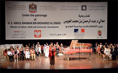 وحضر حفل إعلان الجوائز، الذي أقيم تحت رعاية وزير الثقافة والشباب وتنمية المجتمع عبدالرحمن بن محمد العويس، مدير إدارة التراث والفنون في وزارة الثقافة والشباب وتنمية المجتمع المهندس وليد الزعابي، وسفراء كل من فرنسا وبولندا وهنغاريا والمجر، وسط حشد كبير من أهالي الطلاب والطالبات والمهتمين بالفن الكلاسيكي ومحبي فريدريك شوبان الموسيقي المجري إحياء لذكراه.