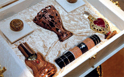 وعرضت «الفايز للعطور» مجموعة كبيرة من الصناديق التي تجاوزت كونها علباً خشبية لتصبح من مقتنيات العروس الثمينة، إذ إن تلك الصناديق صارت تصنع من الجلد الأصلي وتزين بالأحجار الكريمة وقطع الكريستال الأصلي، إضافة إلى استخدام أجود أنواع المخمل لتلبيس الصندوق واضفاء روح الجمال والأناقة والرقي عليه، ليتناسب مع جميع المناسبات.