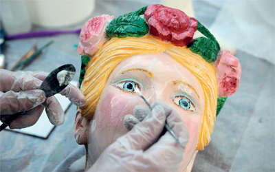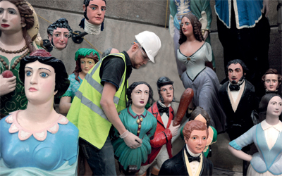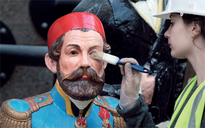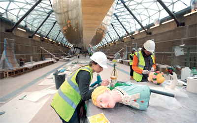 خبراء ينظفون مجموعة من التماثيل والرؤوس، يزيد عددها على 80 قطعة، في الحوض الجاف أسفل هيكل السفينة الشراعية «كاتي سارك»، التي تعود إلى القرن 19 الميلادي، في غرين ويتش في العاصمة البريطانية لندن، الأسبوع الماضي، وبحسب المنظمين تعد هذه أكبر مجموعة أثرية تعود إلى أسطول بحري في العالم.