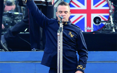 استهل مغني الروب البريطاني روبي ويليامز احتفال اليوبيل الماسي لاعتلاء ملكة بريطانية اليزابيث الثانية العرش، أول من أمس، بأغنيته «لت مي انترتين يو». وأقيم الحفل أمام قصر باكينجهام واستهل فعالياته بإطلاق الالعاب النارية الذهبية. ورافقت ويليامز فرقة ترتدي الزي العسكري. وأدى عازف البيانو الصيني لانج لانج أعمال فرانز ليزست وراشمانيوف. وقبل ساعات من انطلاق الحفل، تم الإعلان عن نقل الأمير فيليب،أ زوج الملكة، إلى المستشفى متأثراً بعدوى في المثانة.