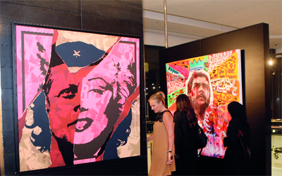وجوه مشهورة وأخرى مغمورة، وكلمات مختزلة باعثة على التأثير الوجداني، تفاصيل منمقة، بجانب ضدها العشوائية، بانوراما لونية تكاد اللوحات تتحول معها إلى ما يشبه عمل فسيفسائي يمكن رصدها، فتلك الأعمال التي يندرج معظمها في إطار فن «الجرافيتي» تهتم موضوعياً بكل شيء يمكن أن يطرأ على مخيلة مبدعيها، بما في ذلك أولئك المهمشون السائرون على أقدامهم في الشوارع، ولكن كما في الواقع فإن صور المشاهير التي تبدو حاضرة، مرشحة لأن تستقطب أيضاً مزيداً من الاهتمام هنا بالنسبة لرواد المعرض، ليس بناء على المعرفة المسبقة بملامح وجوهها فقط، بل لأنها ايضاً تبدو أكثر إبهاراً من سواها، وفقاً للحرفية اللونية التي يعتمدها الفنان كما هي الحال في صور مادونا، تشارلي شابلن، وحتى في صور الشخصيات الكرتونية، ميكي ماوس، وسوبر مان، وغيرها التي نازعت صوراً لوجوه مهمشين ومغمورين.