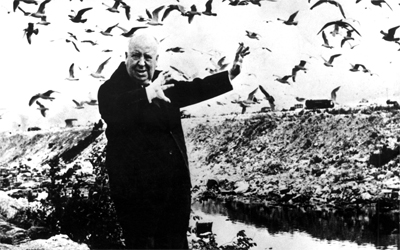 هتشكوك محاطاً بمجموعة من النـــــــــــــــــــــــــــــــــــوارس أثناء تصوير فيلم «الطيور». إفي