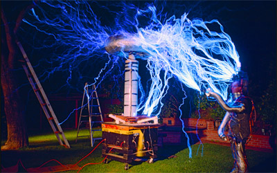 الدكتور ميغافولت استخدم أسلاكاً خاصة من نوع «تيسلا» بقوة تبلغ مليون فولت. من المصدر