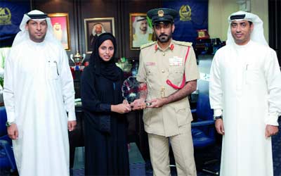 كرمت «الإمارات اليوم» والإدارة العامة للمرور في شرطة دبي، أمس، المواطنة كوثر بن سليم، لجهودها الاستثنائية في الدعوة لتطبيق قواعد السلامة المرورية.