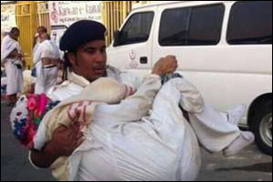طوال 2 كليو متر تقريباً لم يبال أحد السعوديين بكاميرات الهواتف النقالة من العديد من الحجاج التي تتابعه في إعجاب، وهو يحمل حاجة جزائرية فى الثمانيين من عمرها للوصول إلى أقرب مركز إرشاد، حيث يمكن الاستفادة من الخرائط الإلكترونية والحصول على عربة، خاصة أنها غير قادرة على المشي.