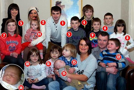 وأضافت أن رادفورد أنجبت كريس البالغ من العمر الآن 23 عاماً، ثم صوفي (18 عاماً)، ثم كلوي (17 عاماً)، وجاء بعدها جاك (15 عاماً)، ودانييل (13 عاماً)، ولوك (11 عاماً)، وميلي (10 أعوام)، وكيتي (9 أعوام)، وجيمس (8 أعوام)، وإيلي (7 أعوام)، وإيمي (6 أعوام)، وجوش (4 أعوام)، وماكس (3 أعوام).