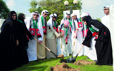غرس عدد من موظفي هيئة تنمية المجتمع في دبي شجرة في مركز الخوانيج المجتمعي، استجابة لمبادرة صاحب السمو الشيخ محمد بن راشد آل مكتوم، نائب رئيس الدولة رئيس مجلس الوزراء حاكم دبي، بزراعة «شجرة الاتحاد»، بمناسبة احتفالات اليوم الوطني الـ41 للدولة.