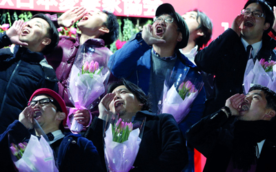أطلق العشرات من الأزواج اليابانيين العنان لأنفسهم للتعبير عن حبهم لزوجاتهم بصوت عالٍ في حفل أقيم في حديقة في طوكيو، أول من أمس.