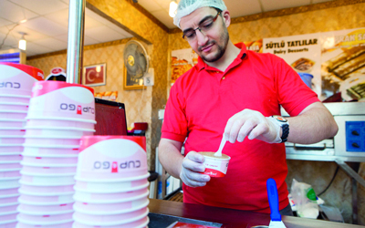 وبينما تتابع جولتك بين أجنحة القرية العالمية، لابد أن تميز وسط تداخل الأصوات، صوت الأجراس المعلقة فوق كشك الآيس كريم التركي، الذي لا يتوقف البائع عن الطرق ليلفت انتباه المارة، الذين غالباً ما يتوفقون لرؤية الآيس كريم التركي الذي يعد أحد أفضل أنواع المثلجات في العالم، ليس لمذاقها المميز إنما طريقة التقديم المبهجة التي يتعمد من خلالها البائع رسم الابتسامة على وجوه الصغار والكبار.