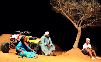 أما ما هو متأصل في زيد فهو اهتمامه بنقل الجماهير من خلال سينوغرافيا العمل لتكون طبيعية، فقد حول مسرح قاعة معهد الشارقة للفنون المسرحية إلى ساحة «البر» أو الصحراء، وما تضمه من كثبان رملية معروفة باللهجة المحلية باسم «العراقيب»، وشجر يابس، ولأن البر لا يكتمل إلا بالدراجات الرباعية فقد دخل الممثلون الثلاثة؛ الفنان علي القحطاني في دور الأب «الشيبة»، والممثلة فاطمة حسن في دور الأم «العجوز»، والطفل عبدالله نبيل في دور «عمر»، على خشبة المسرح بدراجة «الرابتر» التي يقودها الطفل بين رمال الصحراء والكثبان العالية.