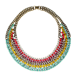 عقد بتصميم عصري مميّز متعدد الطبقات والأحجار والألوان، مناسب للسهرة والمساء من «سارة ديزاين» بـ1700 درهم، وفستان قصير يصل إلى أسفل الركبة بقصّة مبتكرة للصدر، مناسب للسهرة والمساء من«دونا كاران» بـ8200 درهم. يتوفران في «دبي مول» بدبي.