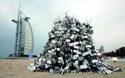 على رمال شاطئ مينا السلام في جميرا وضعت منحوتات 11 فناناً عالمياً في متنزه المنحوتات، الفعالية الجديدة التي اطلقت في الدورة السابعة من «آرت دبي». وحملت بعض المنحوتات مواصفات البناء المعماري، إلى جانب أخرى تحمل صفة التركيب. وتمحورت الأعمال المقدمة حول البناء الذي يصوغ علاقة البشر بالطبيعة من جهة، وبالمادة من جهة أخرى. المتنزه الذي يبلغ مجموع أعماله 19 عملاً، يجمع توجهات فنية طرحت الآراء الخاصة بالفنانين ضمن حدود المسافة التي تحافظ على وجود علامات الاستفهام عند المتلقي حتى مع أكثرها مباشرة. تبرز منحوتة الفنان الأميركي كريس بردن، نزوعه إلى الهندسة المعمارية، من خلال عمله الذي يحمل عنوان «الجسر المتقوس»، الذي بناه بردن من مادة «ستانلس ستيل» على قاعدة خشبية. ويتميز العمل بالتفاصيل الهندسية التي تقسم البناء إلى مربعات صغيرة الحجم تتقاطع وتتداخل مع بعضها لتبرز خلفيته الهندسية التي اكتسبها من الدراسة. عرف بردن بالأعمال التركيبية وكذلك العروض الحية، ولا يتخلى عن فكرة تكرار التفاصيل في معظم أعماله، ليوجد البناء الهندسي الذي يشبع تصوره المعماري والفني في آن، ويعد هذا العمل من أبرز الأعمال الموجودة، كونه الأقدم بينها.