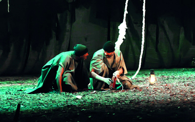 تبدأ المسرحية بمشهد صامت يعكس حالة الانتظار والترقب الطويل للصديقين، وسط غابة تغطي أرضها أوراق الأشجار اليابسة وتسودها ظلمة الليل الموحش، إلا من «فنار» قنديل يعمل بالزيت، هو للرجل الجبان الخائف من هذا المجهول والمضطر عليه، خصوصاً أنه لا أمل له في البقاء في قريته التي أصابه فيها التعفن والموت البطيء، أما الرجل الآخر الذي تمسك بأوراقه وآمن بحكمة الأمل التي زرعتها الكتب في عقله، فصار لا يؤمن بأن المدينة قريبة وأن الأمل قريب وإن طالت المسافات.