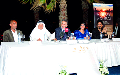 وما بين المنصة الرئيسة وطاولات وُزعت في الهواء الطلق أمام مساحة لا تفصلها سوى أمتار قليلة عن مياه الخليج العربي، كخلفية استثنائية لمؤتمر صحافي، توزع نجوم العمل، حيث تحدث بشكل رئيس بالإضافة إلى مازن عياد، كل من سلطان خسروه، مخرج العمل، والممثلان محمود بوشهري وشهد الياسين، بالإضافة إلى ممثل عن إدارة الفندق التي رحبت باستثمار موقعها لتصوير مشاهد تدعم صورة السياحة العربية عموماً، ودبي بصفة خاصة.