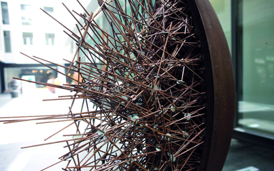 أناشار الذي نشأ في عائلة فنية معروفة بعملها في النحت في لبنان، بدأت مع والده ميشال بصبوص واستكملت مع أعمامه جوزيف وألفريد، يحمل منهجاً مختلفاً وبعيداً عن الذي اتبع من افراد أسرته من قبل. هذا النهج الذي يتبعه الفنان اللبناني والذي ينتمي الى مرحلة ما بعد الحداثة، يبرز أهمية المادة لديه وكيف تتشكل اعماله من خلالها، فنجده مبتعداً عن توظيف الخامة لخدمة الفكرة. أما ما يرصده من خلال هذا المعرض الذي يستمر حتى 17 أبريل، فهو علاقة الإنسان بالكون، فيلجأ الى الجاذبية والعلاقة بين الطبيعة والبشر، ويوجد حواراً بين الكون المصغر الذي يبتكره والرجل، وبين الجسد والروح. كل هذه العلاقات الشائكة يطرحها الفنان اللبناني من خلال المواد الصلبة التي يمنحها الكثير من المرونة بفضل الطبقات التي يبنيها، فتبدو كأنها في حالة عناق أو تكسر، أو حتى تبدو كأنها تنجذب الى بعضها بعضاً عبر آلية مغناطيسية. هذه الآلية التي يشكل فيها مواده تمنح الأعمال خاصية الانتماء الى التجريد وتبعده عن التشخيص، على الرغم من منحه أسماء مباشرة لأعماله.
