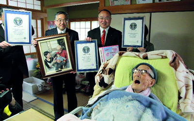 احتفل عميد البشرية، الياباني جيرومون كيمورا، الذي يعد الإنسان الأكبر سناً في العالم، بعيد ميلاده الـ116. وذكرت وسائل إعلام يابانية أن كيمورا ولد عام 1897، ولديه 25 ابن حفيد و13 حفيد حفيد. ويقول إنه لا يدخن، ويشبع من الأكل بنسبة 80٪.