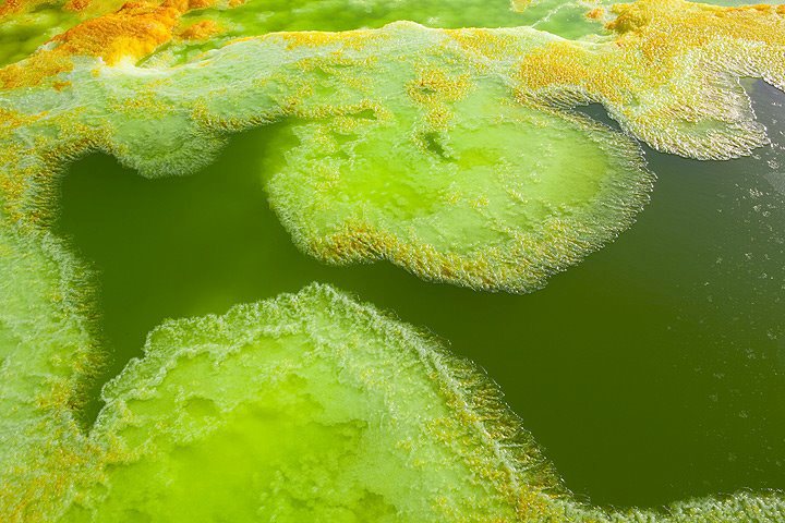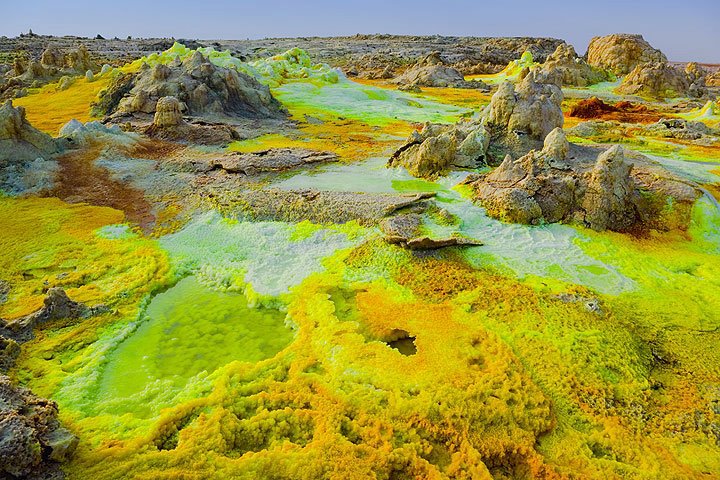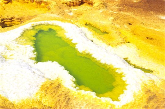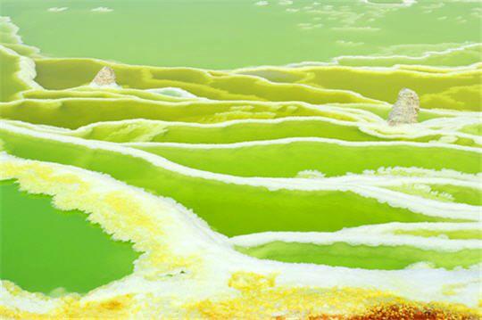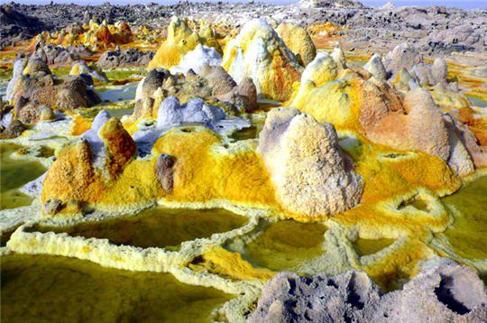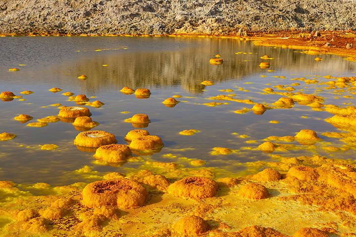 يشكل البركان طبقات فنية جميلة على سطح البحر بمختلف الوان الطيف التى تأتي من أحواض الملح التى تتفاعل فيها أملاح البوتاسيوم مع الكلوريدات والكبريت والأكاسيد المختلفة.