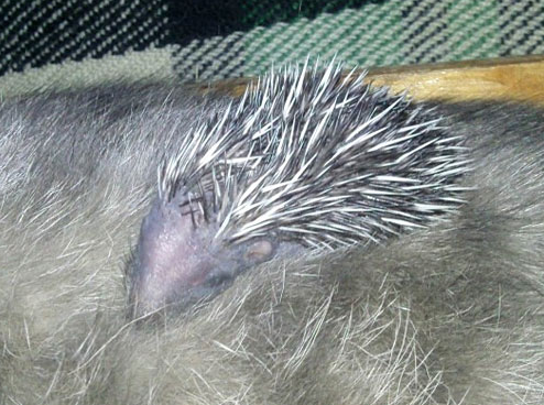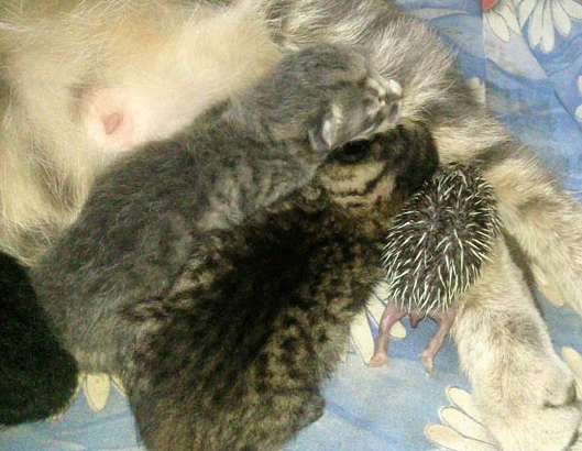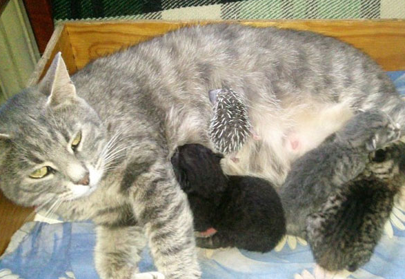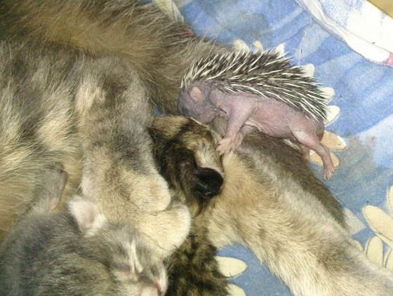 تبنت قطة صغير قنفذ بعد أن تخلت عنه أمه، حيث قامت القطة التي أنجبت قططا صغيرة بالتكفل بإرضاعه مع صغارها.