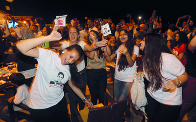 وهتف المحتفلون باسمه وبعضهم رقص على أنغام أغنية «علي الكوفية علي ولولح فيها» التي اشتهر بها عساف قبل مشاركته في برنامج «آراب آيدول».