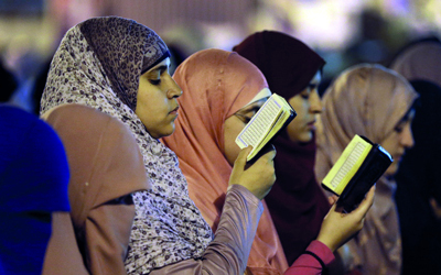 ثمة علاقة وطيدة بين شهر رمضان والقرآن الكريم، ففي هذا الشهر الذي أنزل فيه القرآن هدى للناس، تتفرّغ الناس للعبادة، فهو شهر الرحمة والمغفرة. يعمد الناس إلى ختم القرآن في هذا الشهر، وتكثر الأحاديث التي تتحدث عن فضل قراءة القرآن في شهر رمضان، حيث يقال إن لكل شيء ربيعاً، وإن ربيع القرآن الكريم هو شهر رمضان. وتحث قراءة القرآن في هذا الشهر على الالتزام بالمعاني السامية التي يحتويها والتي تقوم على الرحمة والتسامح والعطاء والخير، مقابل الابتعاد عن كل ما نهى عنه القرآن من المعاصي للخالق. وعلى الرغم من منح الناس مرتبة مهمة لقراءة القرآن يومياً خلال الشهر الفضيل، إلا أنه ليس الطقس الديني الوحيد، فيقوم الناس بتكريس وقتهم للعبادة والصلاة، ومنها صلاة التراويح في المساء عند العشاء، إضافة إلى الدعاء والتسبيح والاستغفار.