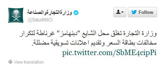 أعلنت وزارة التجارة والصناعة السعودية، عبر حسابها الرسمي على موقع التواصل الاجتماعي "تويتر"، عن إغلاق محل "دبنهامز" في المركز التجاري "غرناطة" بمدينة الرياض.