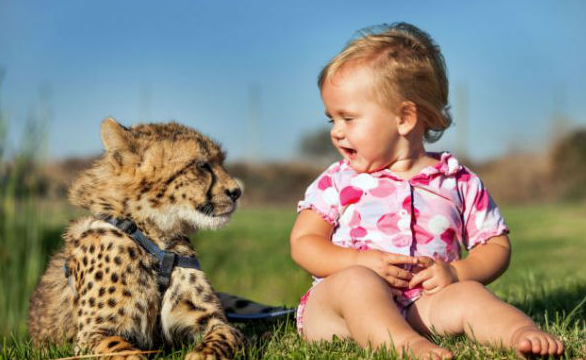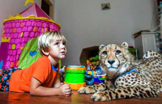 ويتأقلم الأطفال مع الفهود بصورة آمنة ويتعايشان معها دون خوف أو قلق، كما أنها تشاركهم المنزل والمساحات المحيطة به.