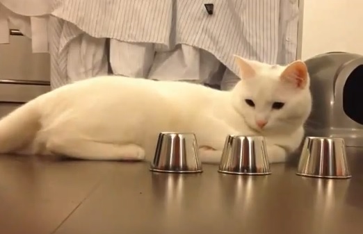 حيث قام مالك القط بنشر كقطع الفيديو، والذي يقوم فيه بإخفاء جرس صغير تحت كوب معدني، ومن ثم خلط الكوب بأكواب مشابهة له، وعندما يتوقف عن الحركة يحدد القط المكان الصحيح للجرس.